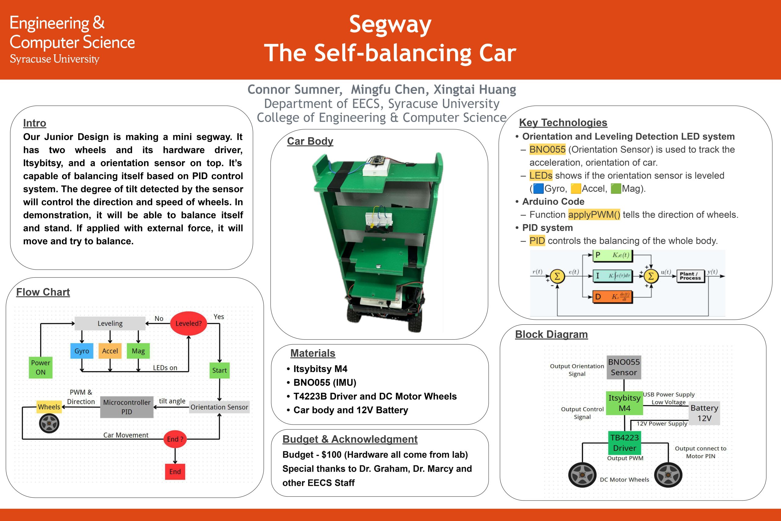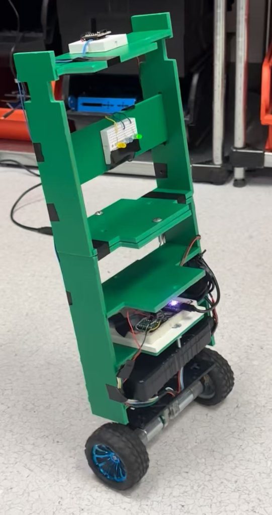 Two-wheel self-balancing car built by a 3-person team; we co-designed the idea, firmware, and mechanical assembly. I acted as the team lead (planning, building, testing sessions, taking notes)