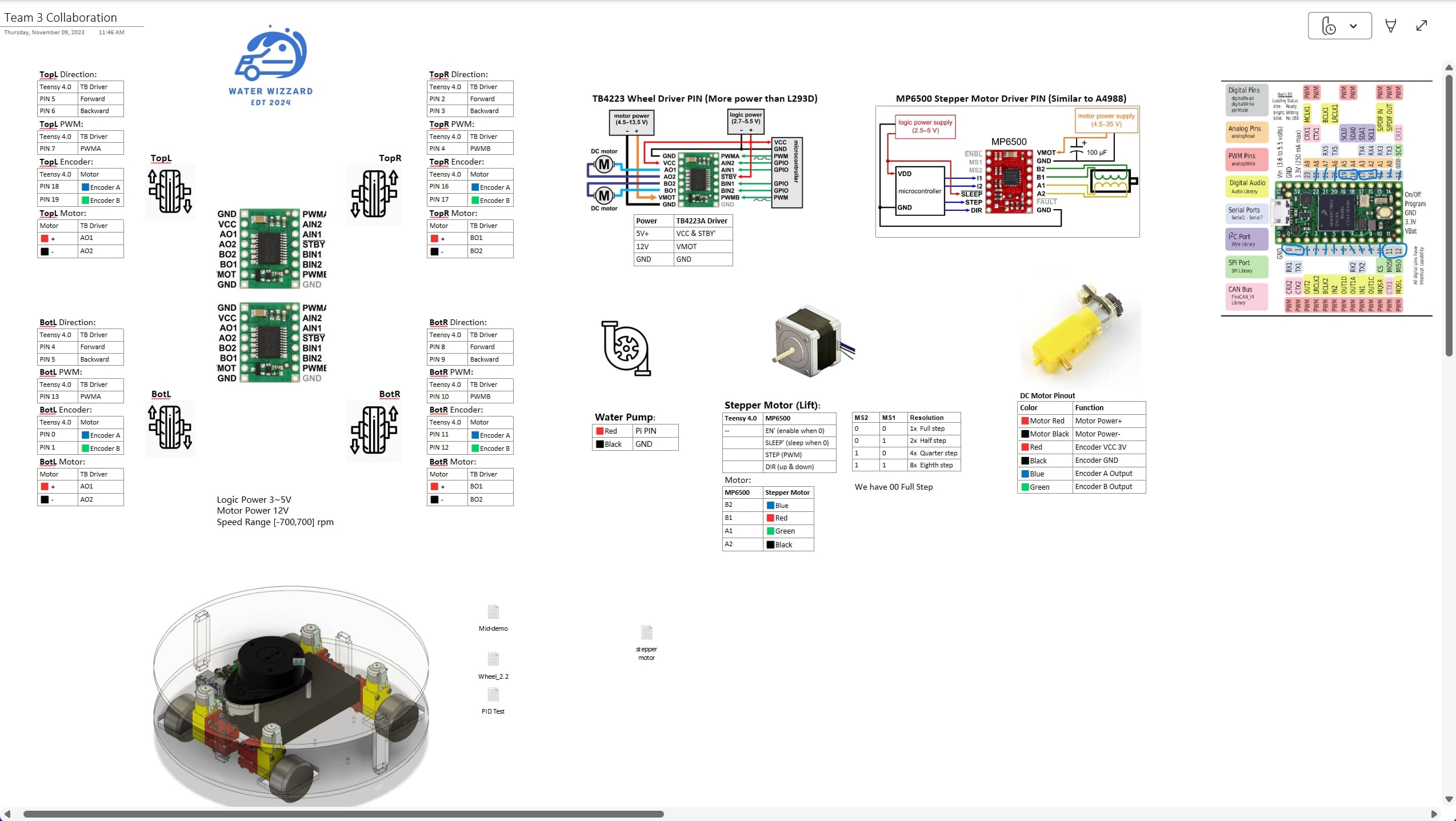 Tech: Teensy 4.0 (Arduino/C), wheel encoders, 4× Mecanum, per-wheel PID, PWM motor driver (12 V, TB4223), stepper lift (A4988), simple digital on/off line for pump